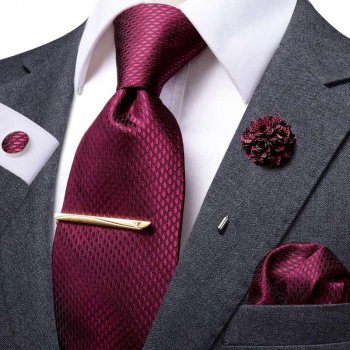 Elegant Red Burgundy Plaid Silk Tie Set for Men