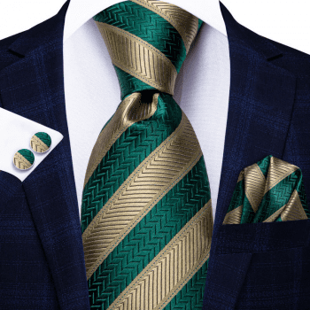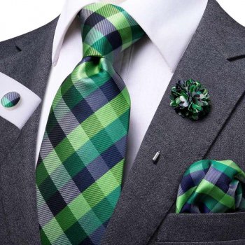 Luxury Green Grey Plaid Silk Necktie Set with Pocket Square and Cufflinks