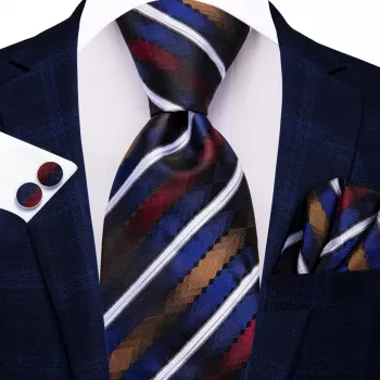 Elegant Burgundy Blue Striped Men’s Silk Tie Set